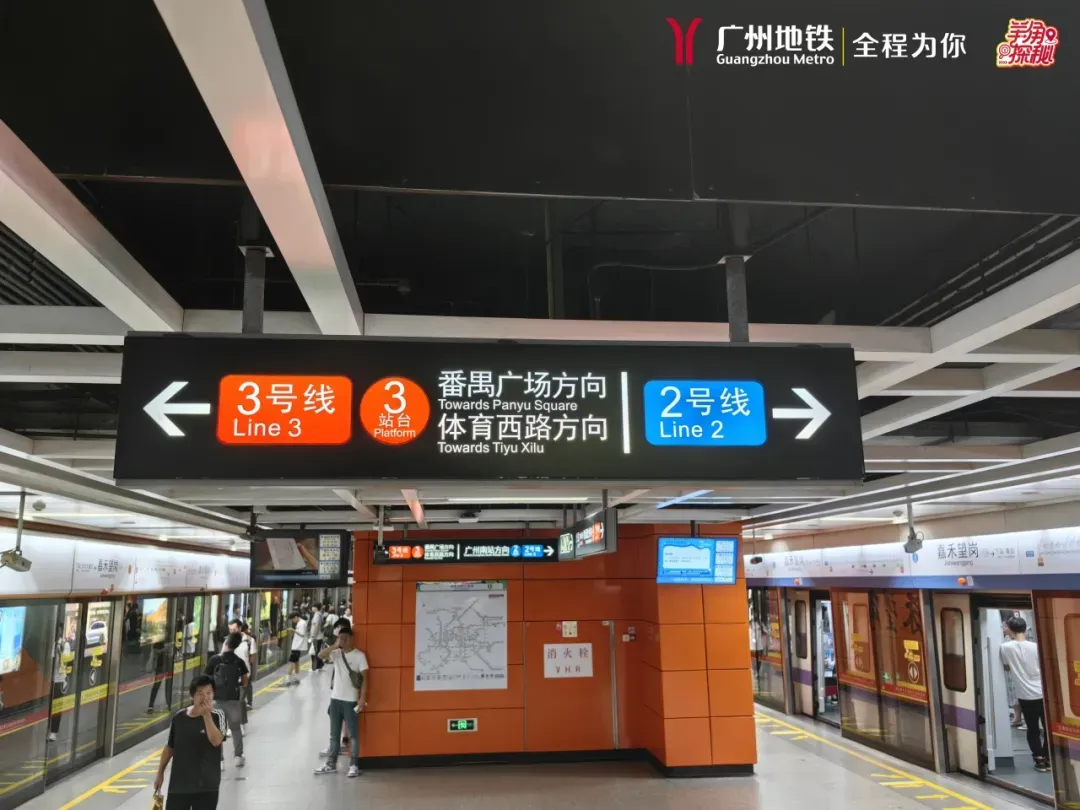 3号线体育西路/番禺广场方向与2号线广州南站方向为同一岛式站台,2条线3个方向可在同一站台快速换乘。